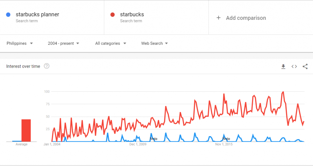 Search Volumes for Starbucks Planner (2004-Present) show very distinct spikes at the end of the year.