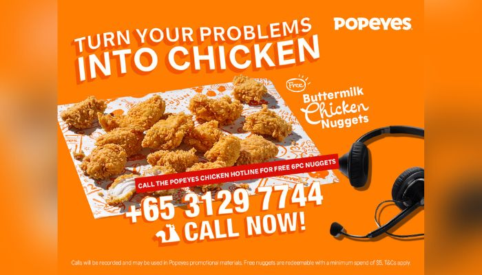 Singapore – Popeyes in Singapore has launched a new campaign to promote its new Buttermilk Chicken Nuggets—in a rather quirky way. The catch? The chain invites Singaporeans to call its hotline and bare their life vents and complaints, in exchange for chicken.